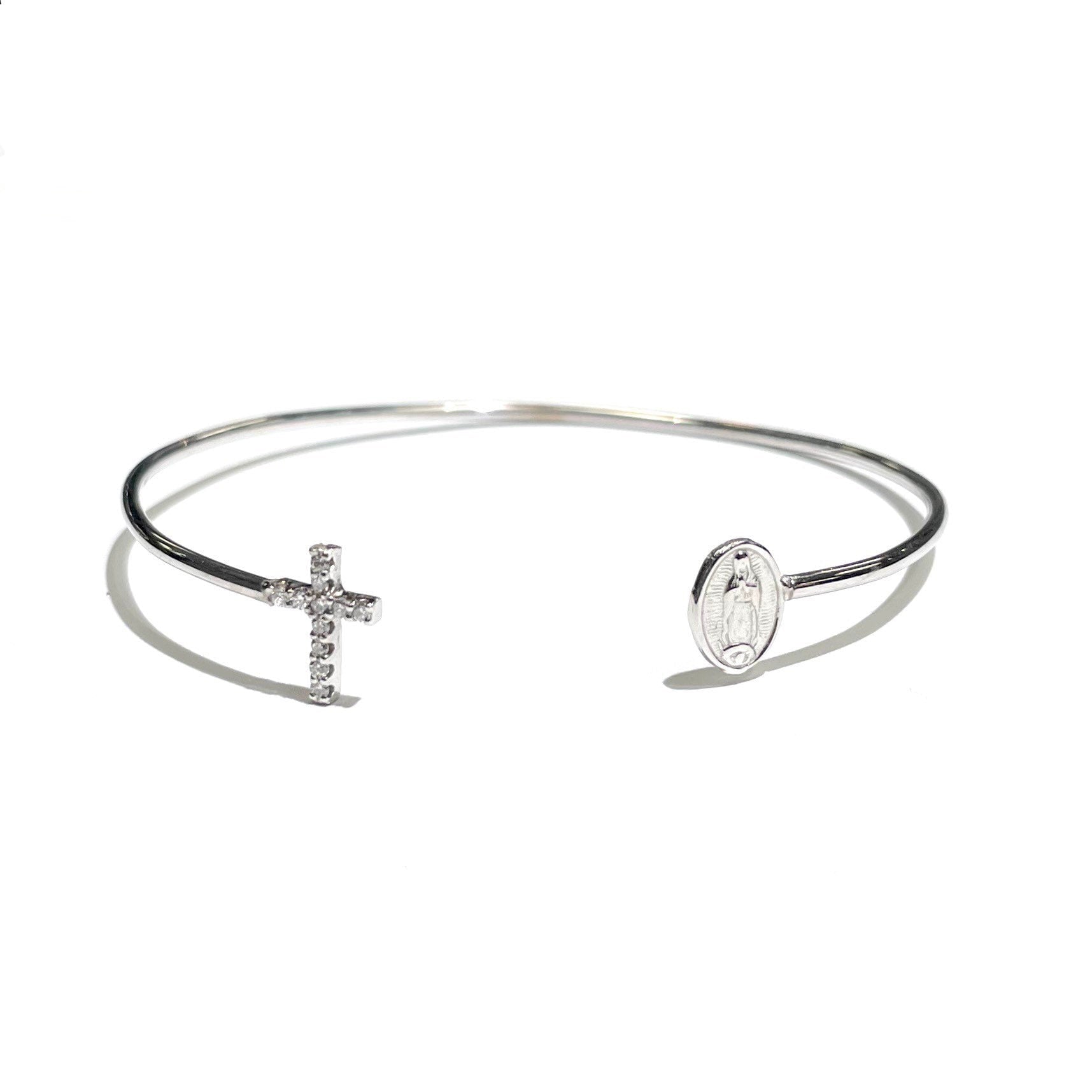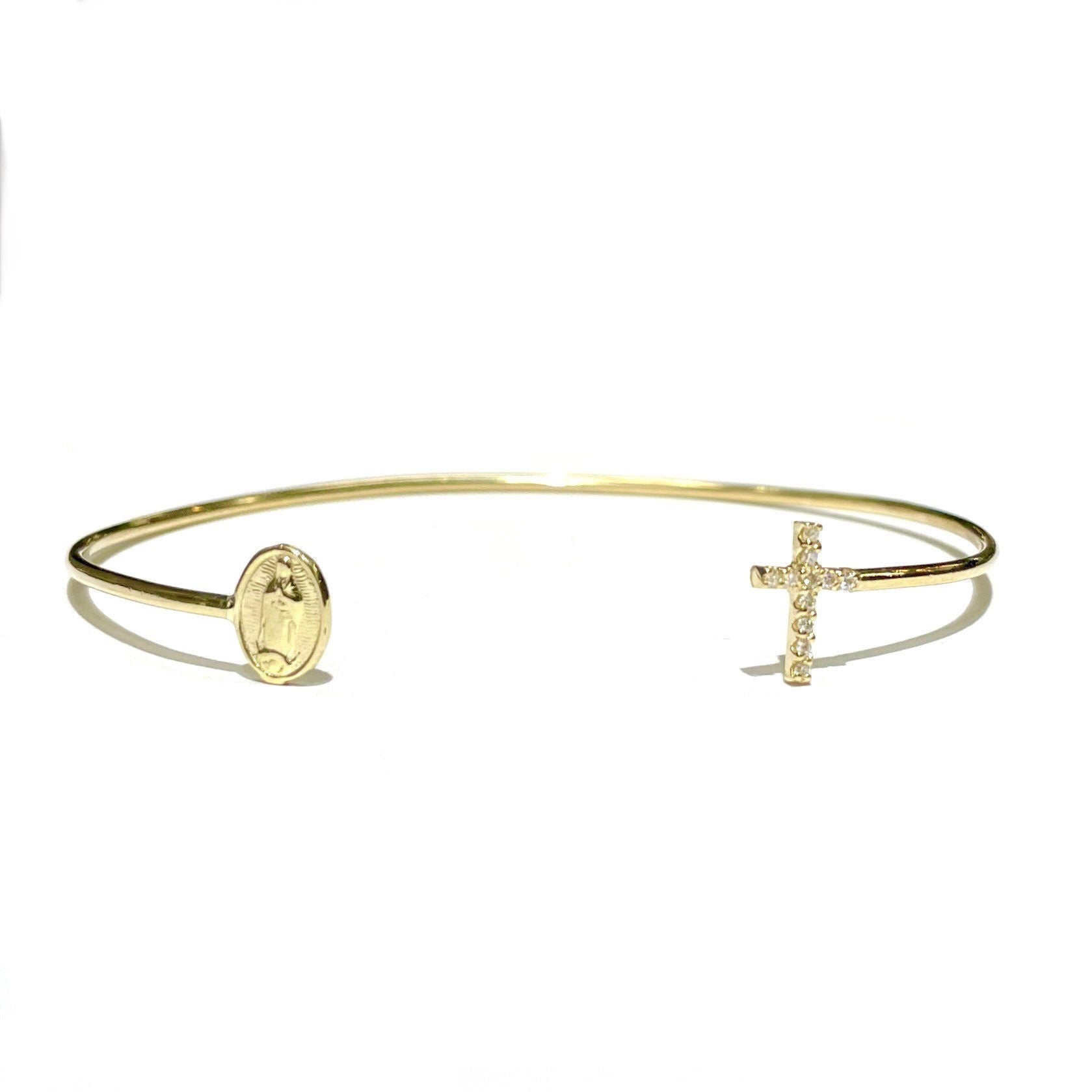 14k Gold genuine diamond Cross and Virgin Mary Bangle . Available in Gold, Rose Gold, or White Gold. Diamond Crosses contain 0.20 cts of diamonds.