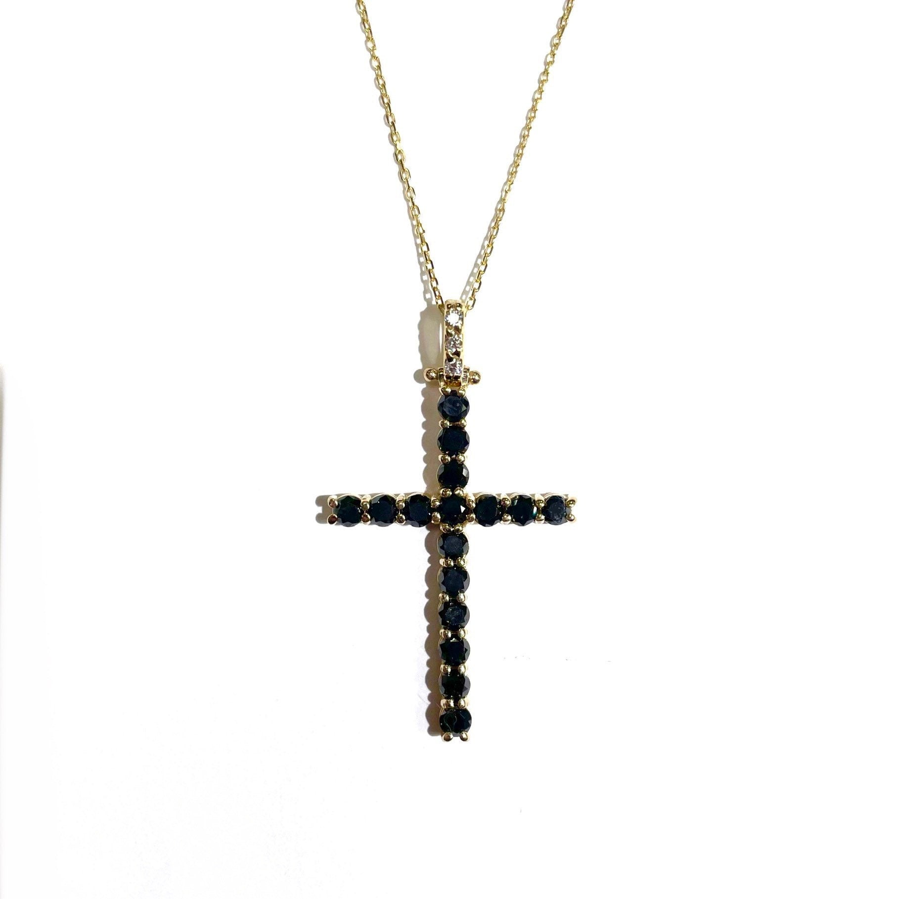 This 14K gold cross contains 2.75 cts of round prong set genuine black diamonds. And 0.10 cts of white diamonds. The diamond cross is roughly 1.5 inches long and an inch wide. Available in 14k yellow, white and rose gold.