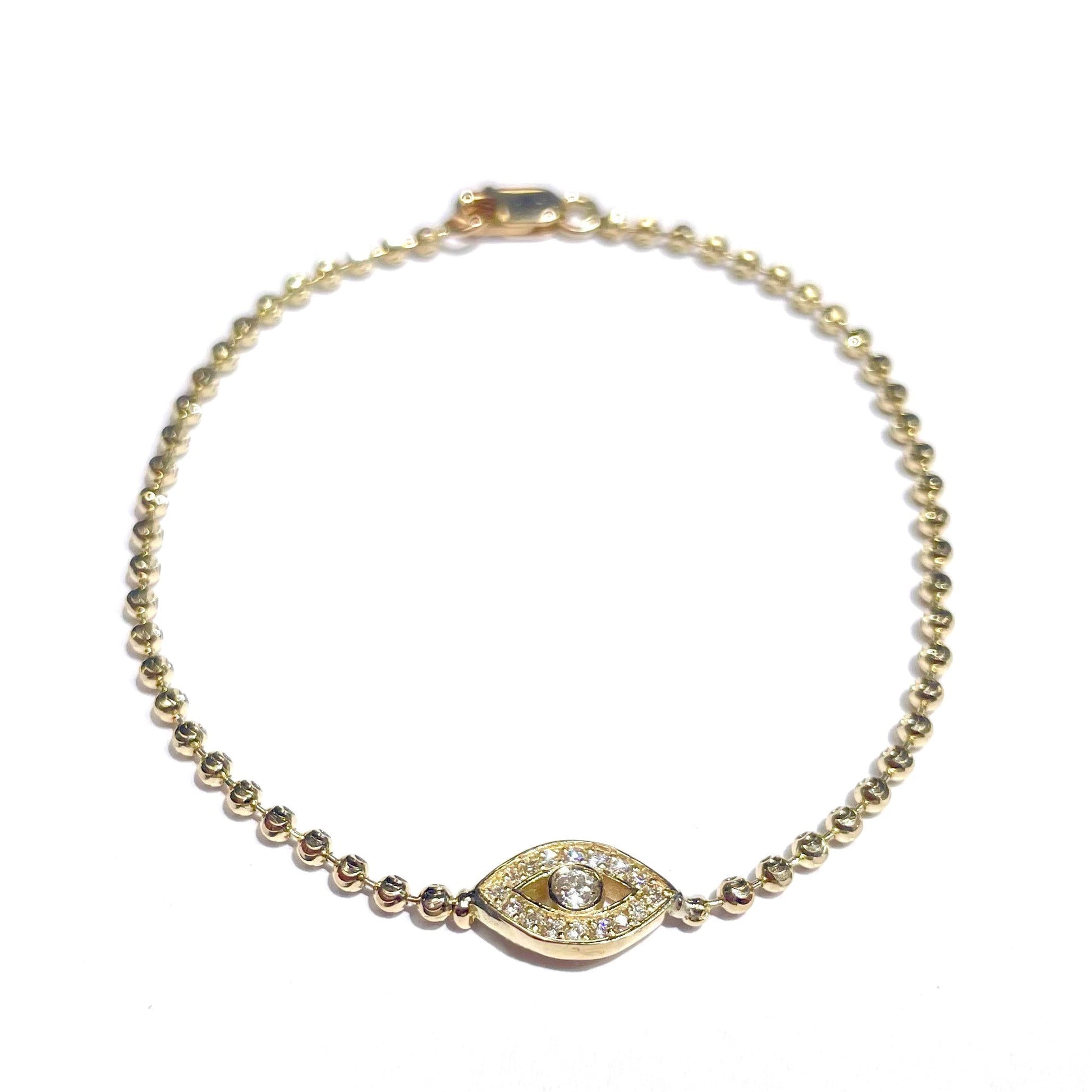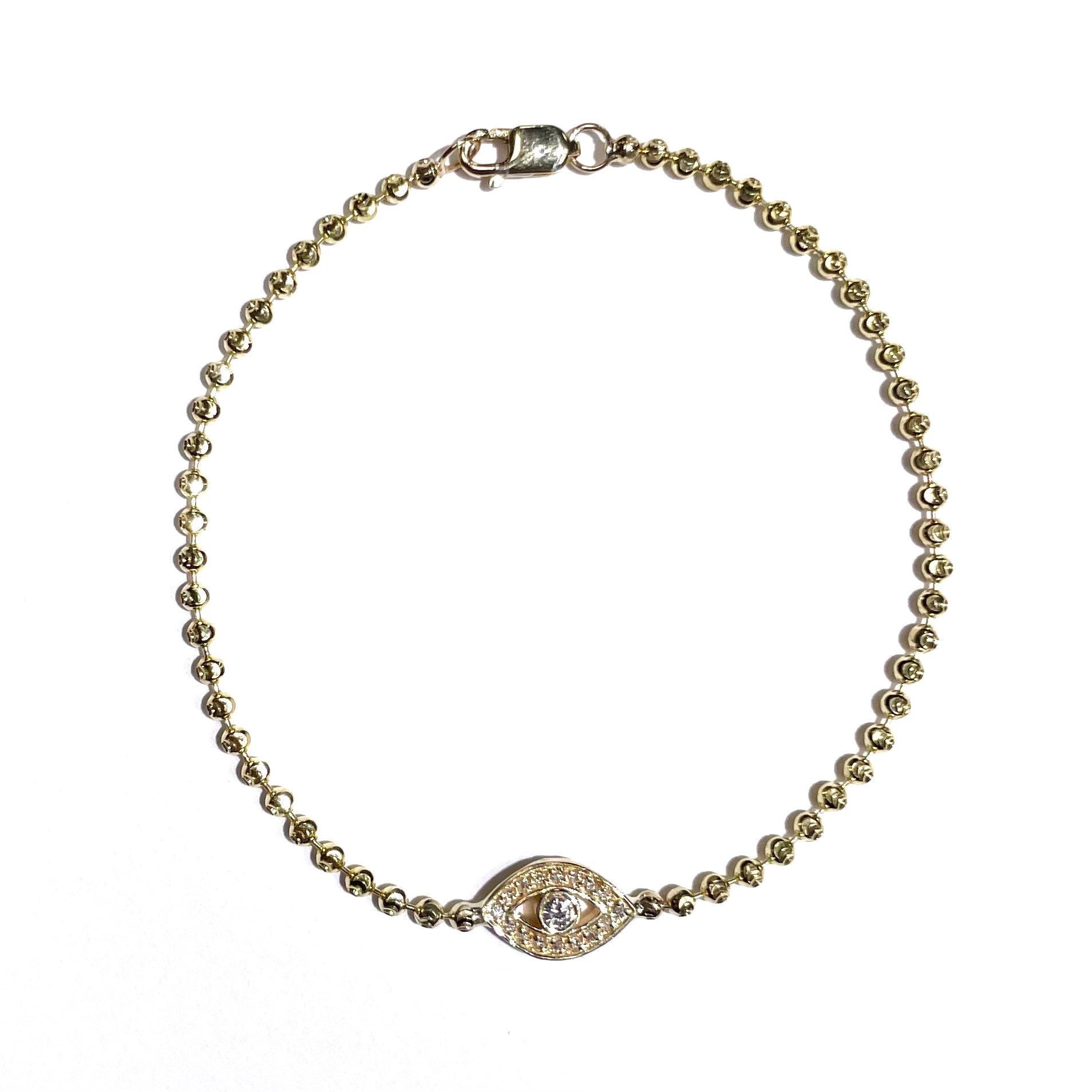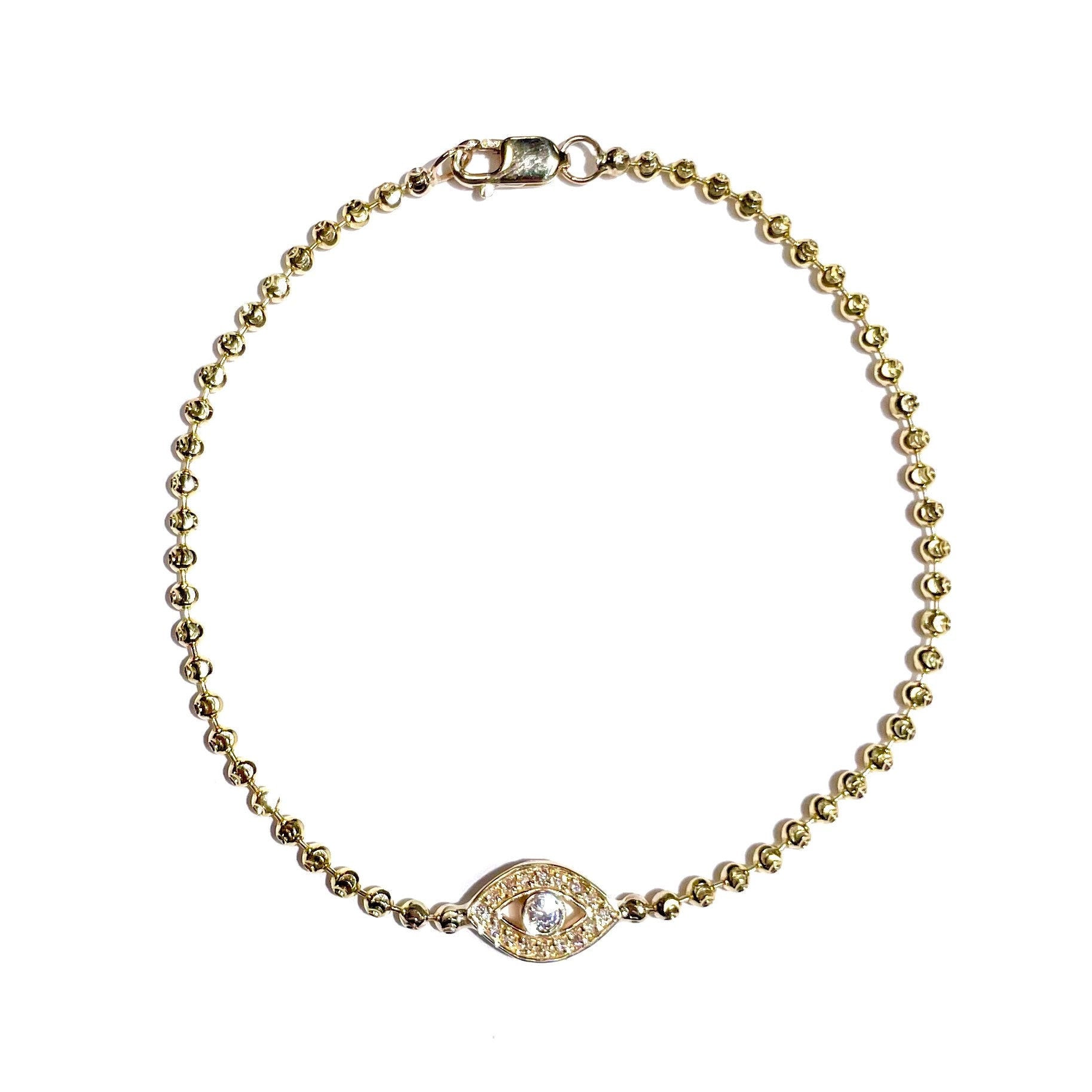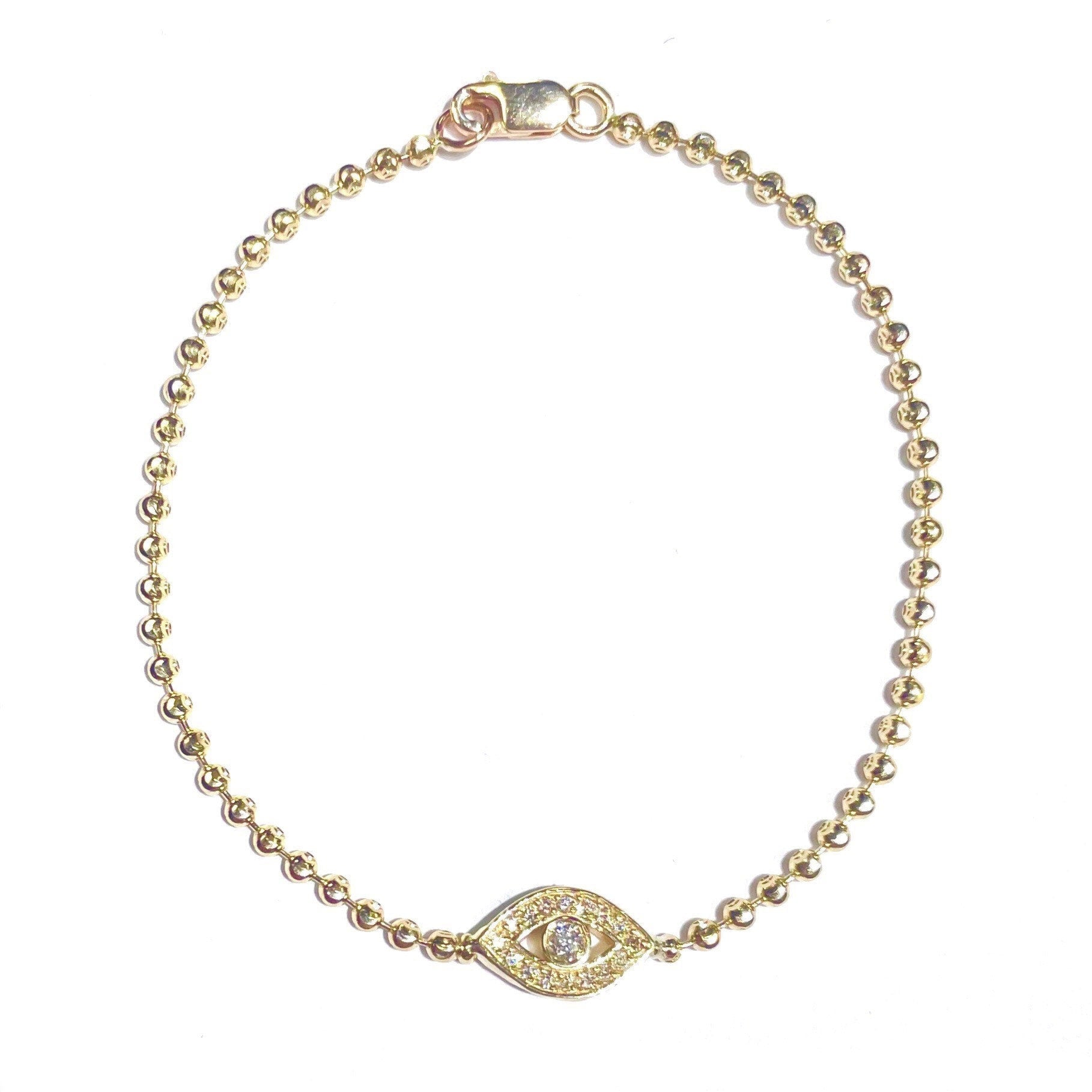 Genuine 14 karat gold bracelet. Attached is a genuine diamond evil eye charm. The evil eye contains roughly 0.20 cts of diamonds. It is approximately 8 mm wide and 5 mm long. Both the charm and the bracelet are available in 14k white, yellow, or rose.